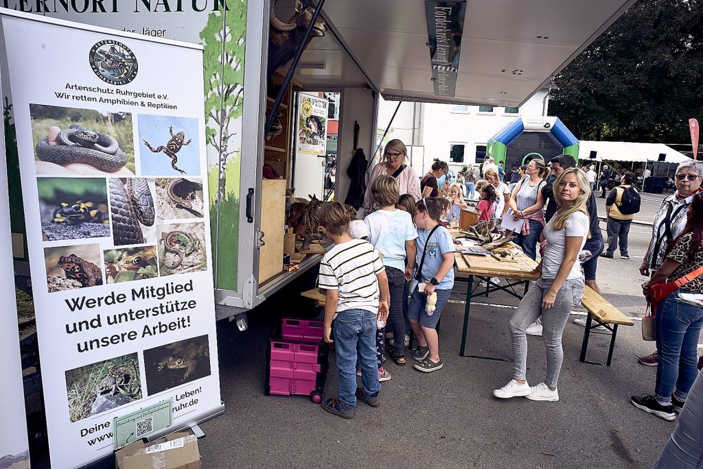 Typisch für Bredenscheid-Stüter: Hier packen viele mit an. Fördervereine der Grundschule und Kita, der Bürgerverein, die Pfadfinder, die Landjugend – die Liste der Beteiligten ist lang. Wer hier mitfeiert, spürt schnell, wie stark die Gemeinschaft im Stadtteil ist. Kreativität und Naturverbundenheit zeigten sich bei vielen Ständen: glitzernde Tattoos, mit Brandmalerei gestaltete Frühstücksbrettchen oder eine lebendige Vorführung der Wildnisschule Ruhrgebiet, die sogar eine mexikanische Strumpfbandnatter präsentierte.