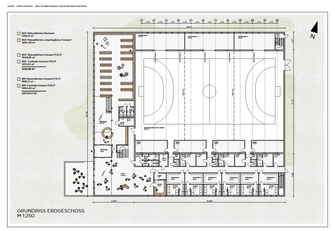 Die erzielte Kostenreduzierung als Voraussetzung für die Fördermittelbewilligung ist u.a. auch auf die Beibehaltung der vorhandenen Bodenplatte der alten Sporthalle zurückzuführen. In einem authentischen Vortrag ging Architekt Jörg Preckel auf vielfältige Baudetails ein. Der Architekt betonte, dass erst nach der vorliegenden Machbarkeitsstudie die Planer mit der Entwurfsplanung beginnen. In seinem Vortrag stellte und bewertete der Architekt viele bautechnische Details. Dabei ging es neben der Raumplanung auch um Belichtung, Belüftung, um Wärmeplanung – auch die Zugangs- und vielfältigen Nutzungsmöglichkeiten wurden vorgestellt.