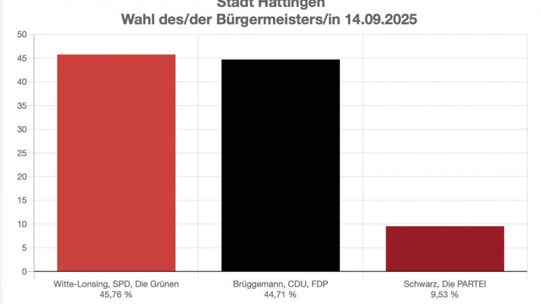 Hattingen – Der Wahlabend in Hattingen ist vorüber, und die Stimmen sind ausgezählt: In einem spannenden Kopf-an-Kopf-Rennen um das Amt des Bürgermeisters haben die Kandidaten Melanie Witte-Lonsing von der SPD mit 45,76 % und Nils Brüggemann, ein parteiloser Kandidat, mit 44,71 % nahezu gleichauf abgeschlossen. Das Ergebnis verdeutlicht das große Interesse der Hattinger Bevölkerung an ihren zukünftigen politischen Vertretern.