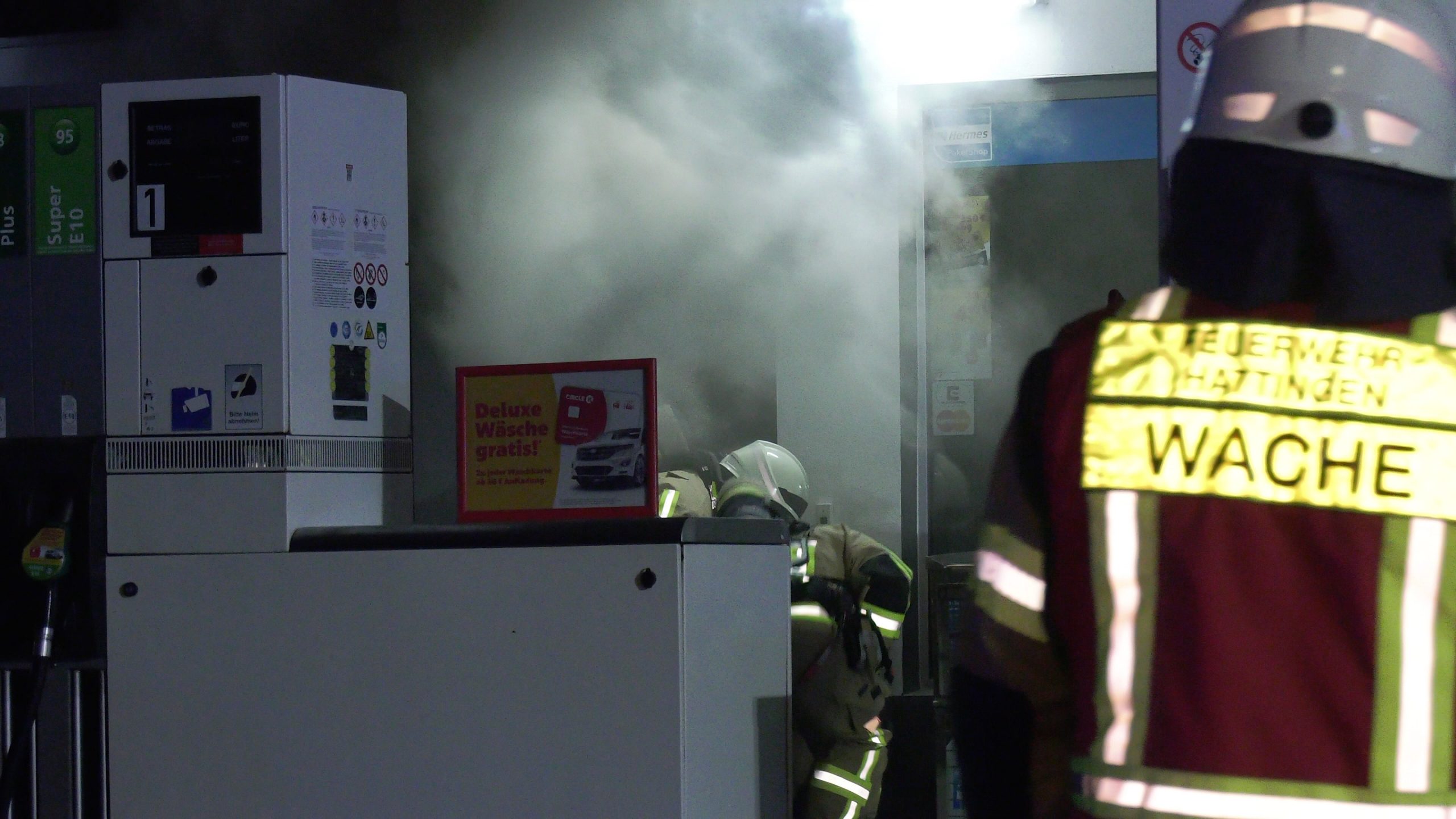 Beim Eintreffen der ersten Einsatzkräfte an der Tankstelle in Welper bestätigten sich die zahlreich eingegangenen Notrufe. Aus mehreren Öffnungen der bereits geschlossenen Tankstelle trat Rauch aus, die Einsatzkräfte der Feuerwehr verschafften sich unter schwerem Atemschutz Zugang zum Verkaufsraum. „Dabei kam hydraulisches Spreizgerät zum Einsatz“, so Feuerwehr Pressesprecher Jens Herkströter.