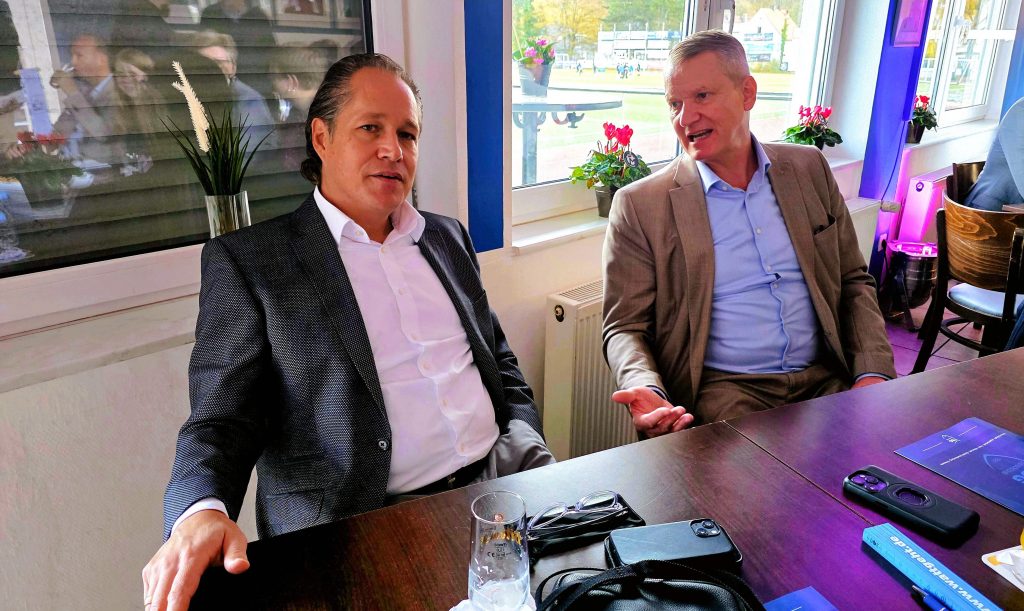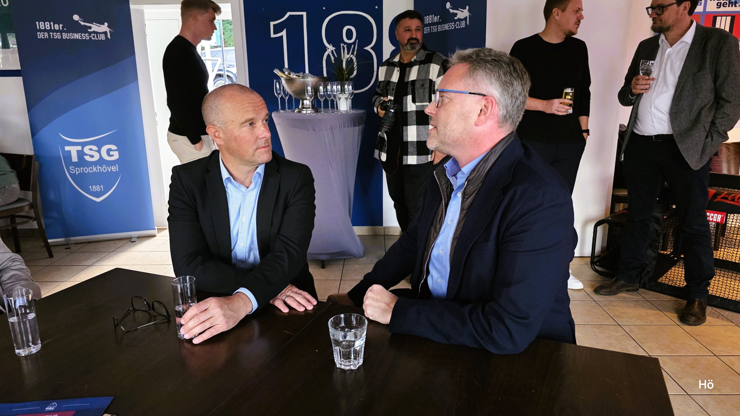 TSG Sprockhövel: Oliver Flüshöh (Spk. Schwelm-Sprockhövel) (li.) und Frank Richert (TSG-Hauptsponsor wattgeht GmbH) (re.) beim 6. Unternehmer-Netzwerktreffen. (Foto: Höffken)