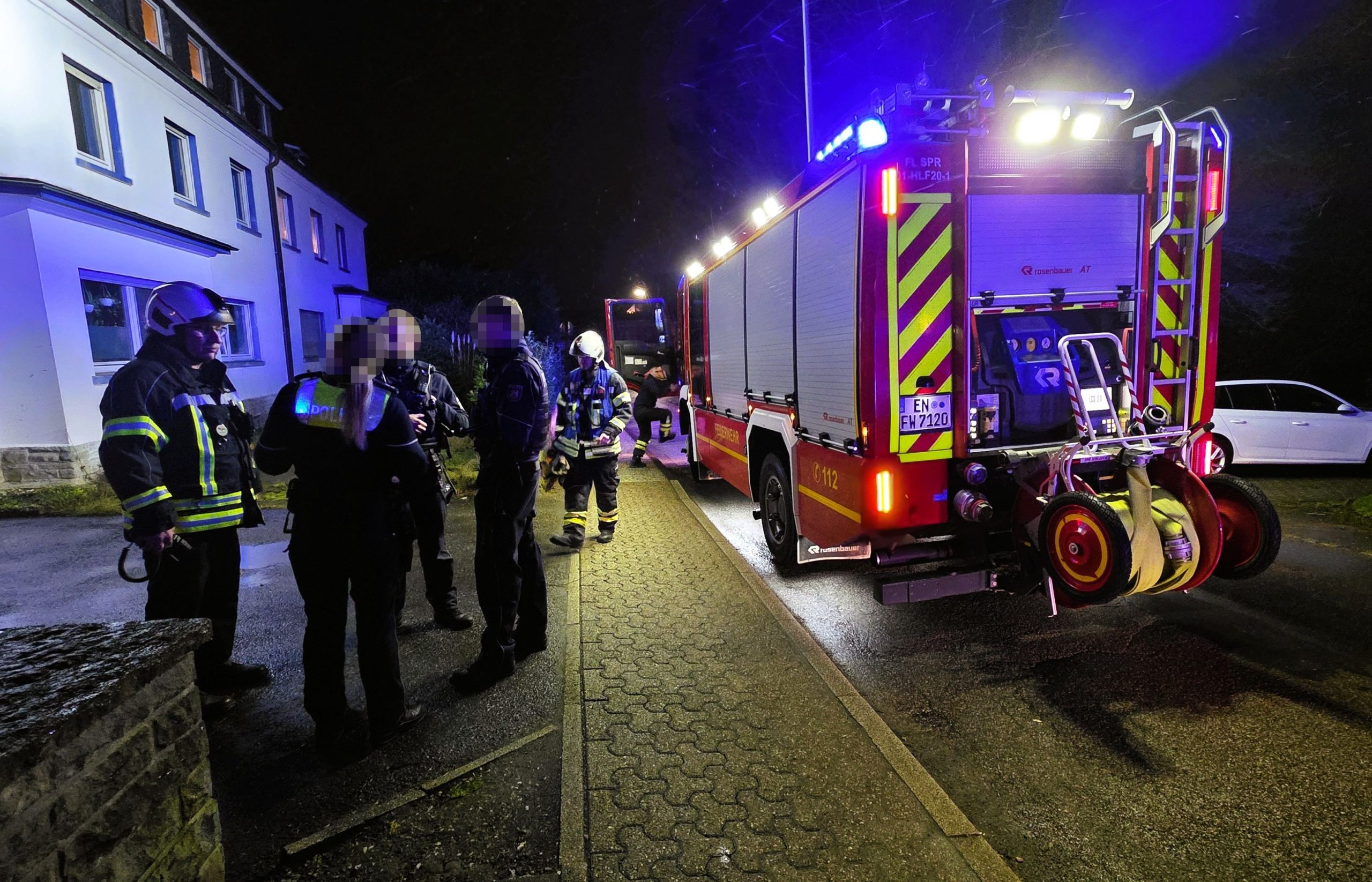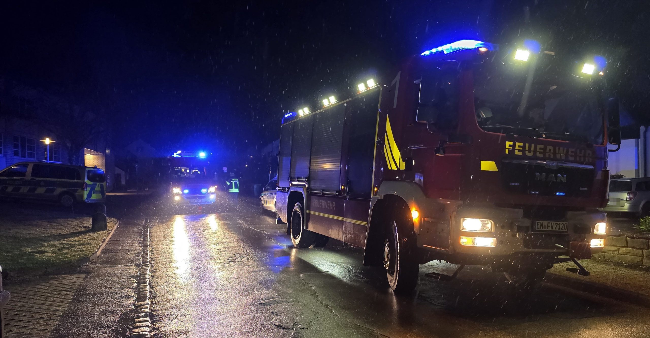 Blaulichter zuckten durch die Dunkelheit, als schon wenige Minuten nach der Alarmierung die Einsatzfahrzeuge vom Feuerwehrhaus auf der Hiddinghauser Straße aus zur Hombergstraße fuhren. Auch die Polizei war mit zwei Streifenwagen schnell an der Einsatzstelle. Weitere „Einsatzmittel“ des Löschzuges standen in einem Bereitstellungsraum auf der Wuppertaler Straße.
