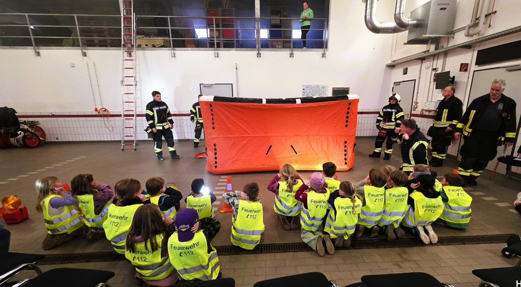 Als die gelben Feuerwehrwesten an die Kinder verteilt wurden, stieg die Spannung, zumal auf der Empore etwas Partynebel zu sehen war und auch eine Frau. Ruhig erklärten die Kräfte des Löschzuges den Ablauf der Rettungsübung. „Haltet euch jetzt die Ohren zu, denn beim Aufblasen des Sprungpolsters (Sprungrettungsgerät) wird es laut“, sagte ein Feuerwehrmann und die Kids staunten, wie schnell ein Sprungpolster oder Rettungskissen mit etwas „Getöse“ aufgeblasen werden kann.