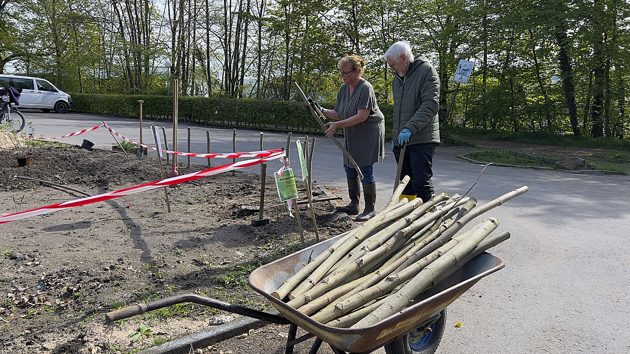 In die senkrecht stehenden Stämme wurden Löcher gebohrt, damit Wildbienen dort Nistplätze finden. Der Flechtzaun nahm ebenfalls weiter Form an. Dazu kamen neue Stauden, und ein Streifen Schmetterlingssaum wurde ausgesät. Noch ist das Ganze nicht fertig, aber genau das macht den Reiz aus: Man kann zusehen, wie aus einer Idee langsam ein richtiger Ort wird.