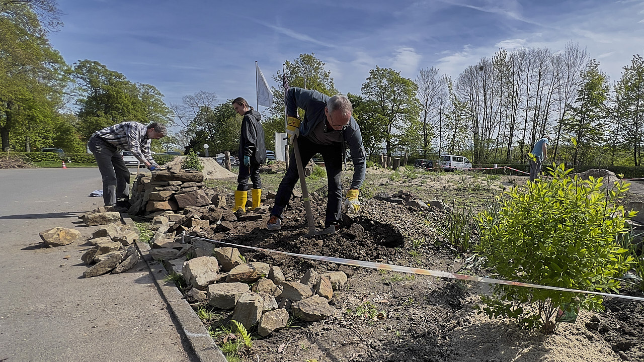 Und es bleibt noch einiges zu tun. Weitere Pflanzungen sind geplant, am Bereich mit dem Wildbienensand soll weitergearbeitet werden, dazu sind zusätzliche Strukturen aus Holz und Stein vorgesehen. Lambert sprach auch von einem „lebenden Holzhaufen“ – also einem Bereich aus Totholz, in dem trotzdem oder gerade deshalb sehr viel Leben steckt.