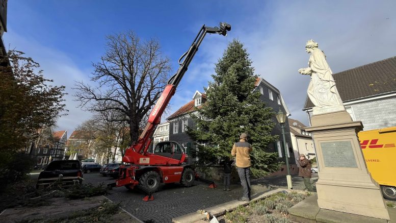 Hattingen – Der Duft von Tannennadeln und die Vorfreude auf die besinnlichste Zeit des Jahres wehen durch die Luft, denn der große Weihnachtsbaum für den nostalgischen Weihnachtsmarkt ist heute (3. November 2025) auf dem Kirchplatz eingetroffen und wurde direkt aufgestellt.