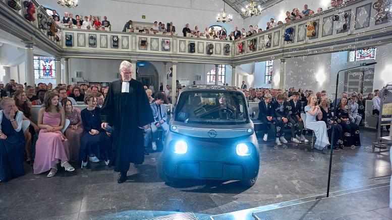 Doch das eigentliche Highlight kam im feierlichen Gottesdienst. Als viele schon dachten, mehr Überraschung geht nicht, rollte plötzlich ein Auto durch die große Kirchentür. Kein SUV, kein Sportwagen, sondern ein Opel Rocks-e – ein kleines Elektrofahrzeug, das maximal 45 km/h fährt und bereits ab 16 Jahren erlaubt ist.