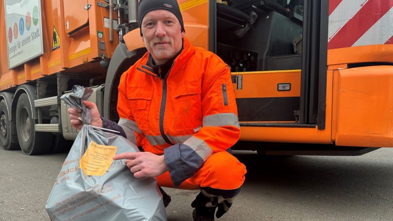Müllwerker Thorsten Dörr setzt die Sticker ab Januar mit seinen Kollegen ein (Foto: Stadt Hattingen)