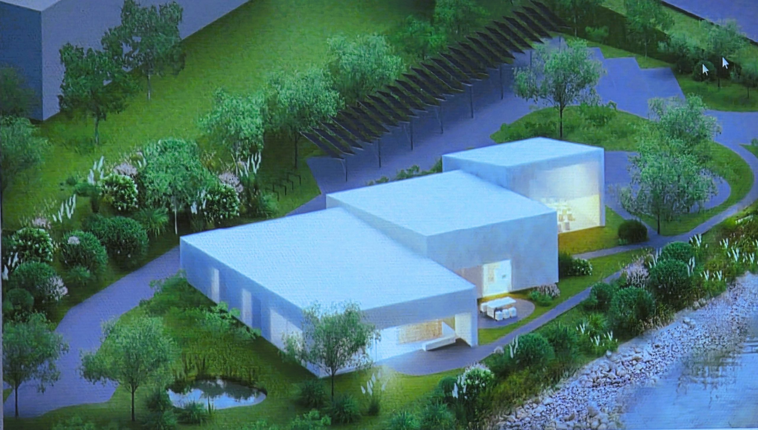 Geplant ist die Errichtung eines dreiteiligen-Gebäudes, in dem mehrere Nutzungen stattfinden sollen. In dem Gebäude sollen ein flexibel nutzbarer für die Stadtgesellschaft geöffneter Werkraum, ein Datacenter, ein Büro (sog. Hybrid Office) sowie eine Tierarztpraxis in Verbindung mit einer Tierphysiotherapie sowie einem Tiersalon untergebracht werden. So ist dem Werkraum eine Außenterrasse und der Praxis ein Therapieteich angegliedert. Die Stellplätze sind im rückwärtigen Teil zum Gewerbegebiet angeordnet.